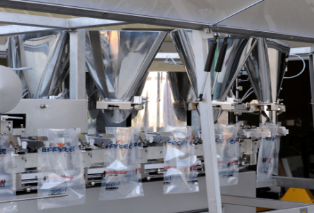 Horizontal form fill and seal packaging machines handle the process the of forming, filling and sealing a pouch from a roll of film which is fed horizontally through a synchronized pouching system. With an efficient footprint, stainless steel construction, and automatic film splicers, HHFS systems are a cost efficient automated solution to to producing pouches at high throughputs. HFFS systems can package a wide range of range of products in flat three or four-sided seal sachets, including stand-up pouches with re-closable zipper or caps.